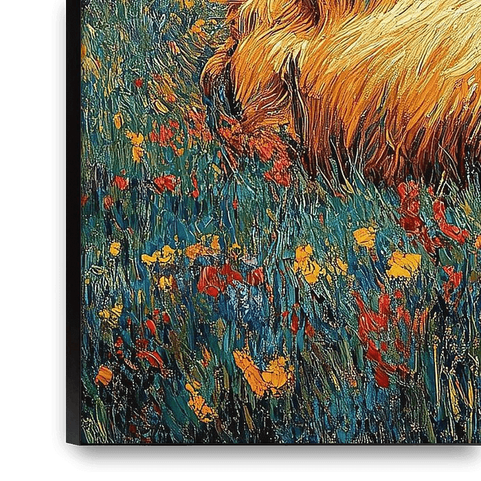 Peinture à l'huile représentant une vache des hautes terres couchée dans l'herbe, avec des falaises côtières, des fleurs et la mer en arrière-plan par une journée ensoleillée