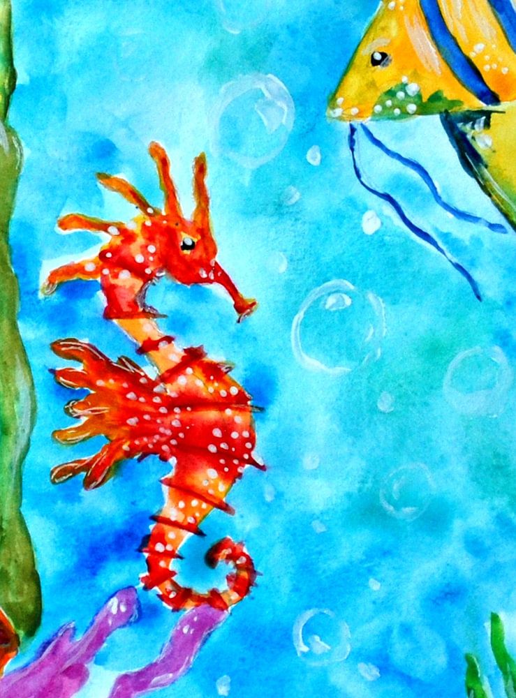 une œuvre d'art traditionnelle à l'aquarelle d'une scène sous-marine dans un récif de corail, où un petit hippocampe et un petit poisson semblent être les meilleurs amis du monde.