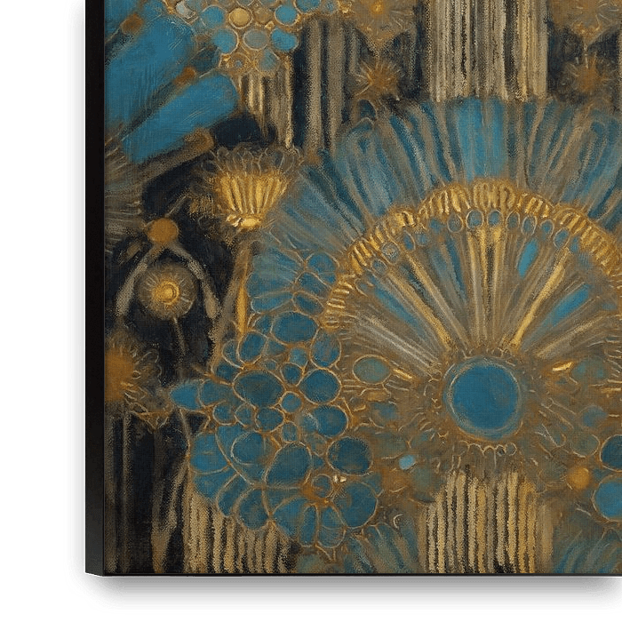 Cette œuvre combine de riches teintes de bleu et d'or pour créer une composition impressionnante. Les rayons et les cercles donnent l'impression d'un horizon rempli de soleils levants, tandis que les détails ajoutent une profondeur intrigante. Les accents dorés dégagent de la chaleur, tandis que les tons bleus ont un effet apaisant.…