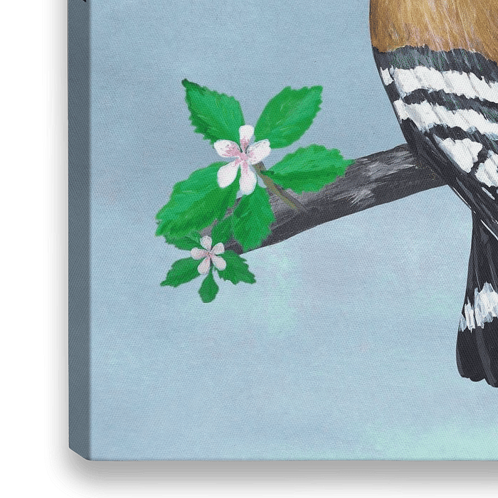 Une peinture à l'encre acrylique d'un Huppe fasciée. Cet oiseau très rare a une belle couleur orange et une crête exubérante. On peut voir l'oiseau sur son dos, où l'on peut voir le magnifique motif de rayures noires et blanches de ses ailes. L'oiseau est assis sur une branche d'arbre avec des feuilles et des petites fleurs blanches.