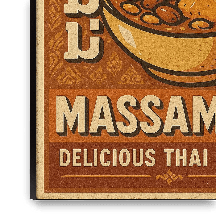 Faites entrer la richesse du curry le plus aromatique de Thaïlande dans votre maison grâce à ce poster rétro sur le curry Massaman. L'œuvre d'art représente un bol de curry fumant rempli de viande tendre, de pommes de terre et de cacahuètes, encadré par des motifs dorés d'inspiration thaïlandaise et une écriture traditionnelle. Avec ses…