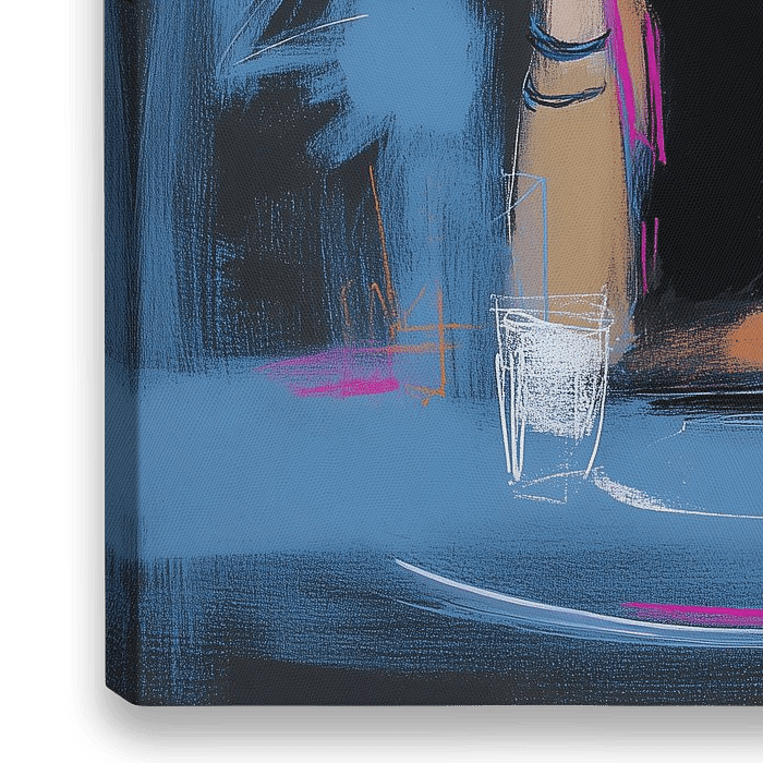 "Cette œuvre d'art numérique saisissante, qui fait partie de la collection 'Electric Nocturnes&#039 ;, capture un moment d'intense fraîcheur urbaine et de solitude. Le portrait se concentre sur une femme élégante assise à une table dans un bar, la cigarette tenue avec un sens de défi ou de contemplation profonde. Une…
