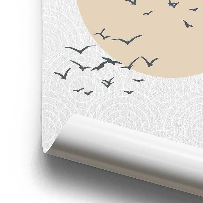Paysage abstrait avec soleil et oiseaux sur un motif géométrique japonais. Style d'intérieur scandinave, japonais, basique, bohème.