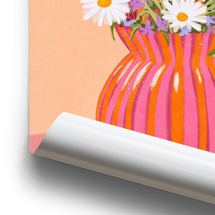 Illustration colorée d'un bouquet de fleurs dans un vase à rayures orange et rose.