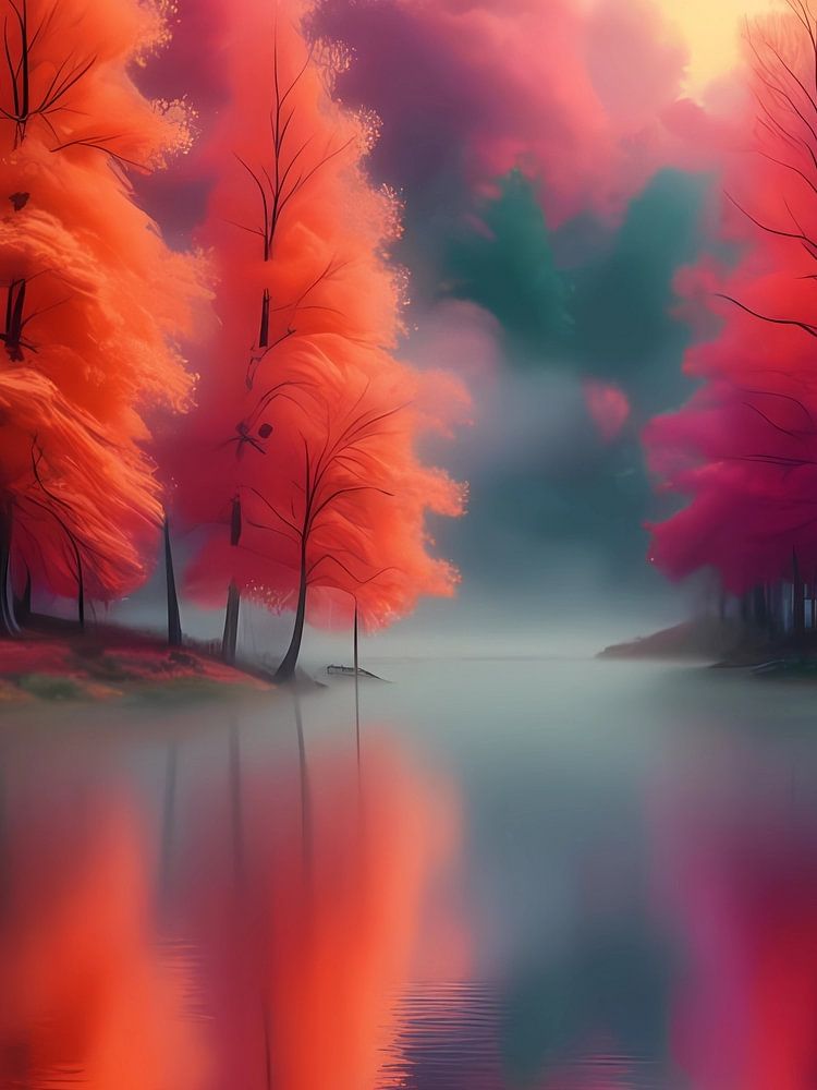Cette peinture numérique vibrante capture une scène sereine au bord d'un lac baigné dans les teintes chaudes de l'automne. Des arbres imposants aux feuilles dans les tons orange vif et magenta profond bordent le rivage brumeux, leurs reflets colorés scintillant à la surface de l'eau calme. La lumière douce et diffuse de l'aube ou du crépuscule jette une lueur tranquille sur le paysage, créant une atmosphère de rêve.