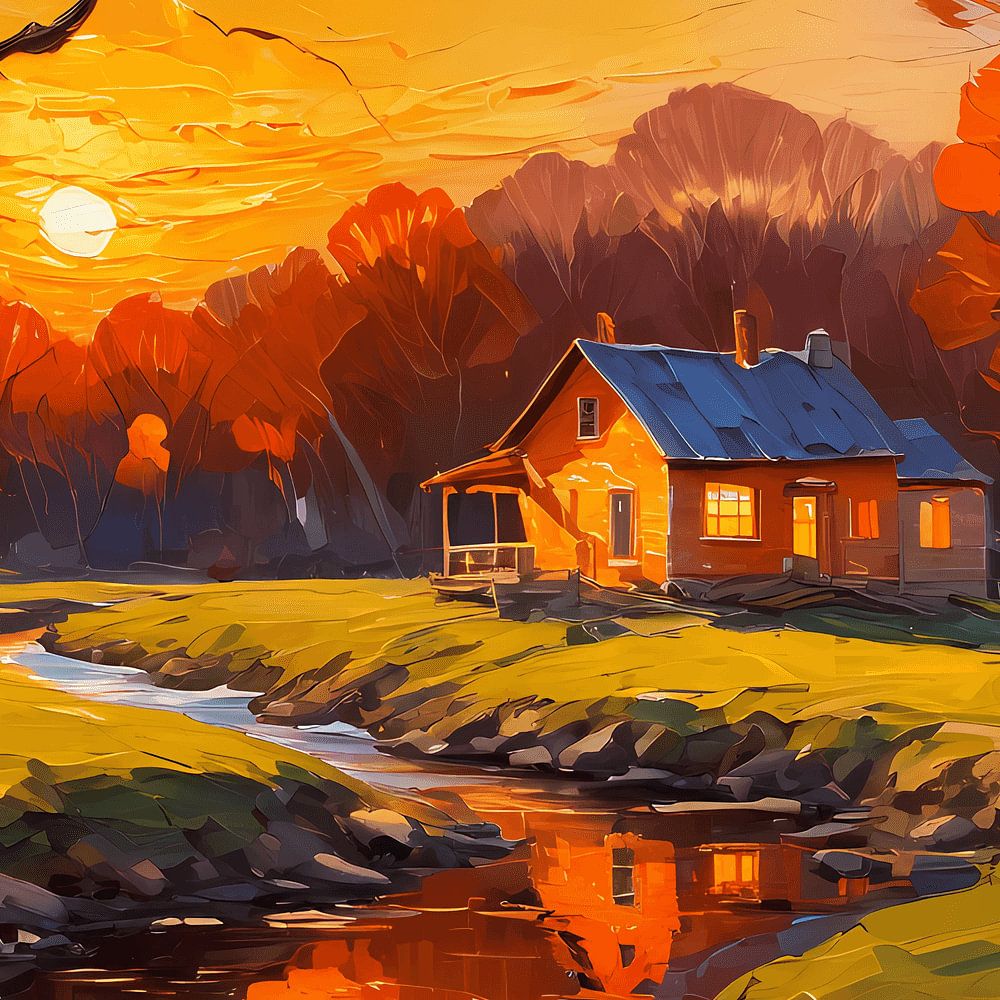 Une peinture à l'huile vibrante qui capture la beauté sereine d'un paysage d'automne. Une cabane confortable nichée au milieu d'arbres colorés se reflète chaleureusement dans le doux courant d'un ruisseau, tandis que le soleil couchant baigne la scène d'une lumière dorée. Les épais coups de pinceau empâtés créent une image texturée et dynamique, évoquant un sentiment de chaleur, de paix et la beauté tranquille de la nature en automne.