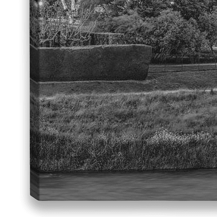 * Carcassonne Lake Night View * Photographie en noir et blanc. Panorama de la cité médiévale de Carcassonne, dans le sud de la France, dans une lumière du soir évocatrice. Au centre de l'image, on voit les remparts de la ville fortifiée, inscrite au patrimoine mondial de l'UNESCO. Au premier plan, on voit le vieux pont du 14ème siècle…