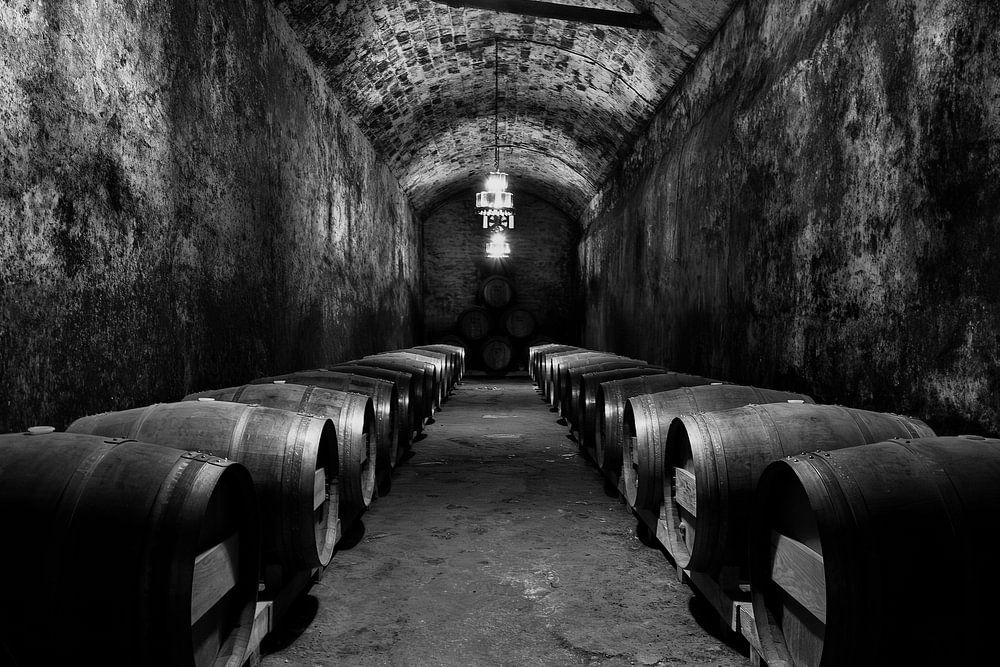 Photo en noir et blanc de tonneaux de vin en bois dans une cave à vin