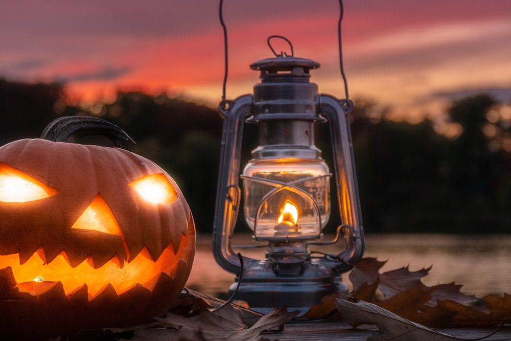 Une citrouille d'Halloween sur une promenade au coucher du soleil, cette fois avec des bougies et la lampe à main.