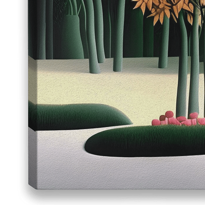 Le tableau représente une forêt étrange, où des chemins sinueux serpentent entre des arbres sombres et clairs. La scène est animée par la présence d'étranges orbes roses disséminés çà et là dans le paysage. L'ensemble forme un mélange intrigant d'éléments naturels et d'ajouts abstraits. L'ensemble forme un…