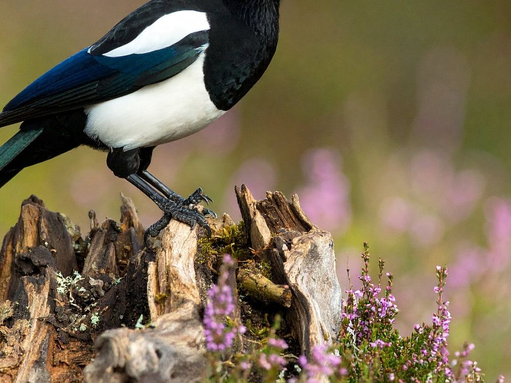 Deze foto toont een ekster op een verweerde wortel, omgeven door zachte naturuurtinten en een vageer achtergrond, die rust uitstraalt.