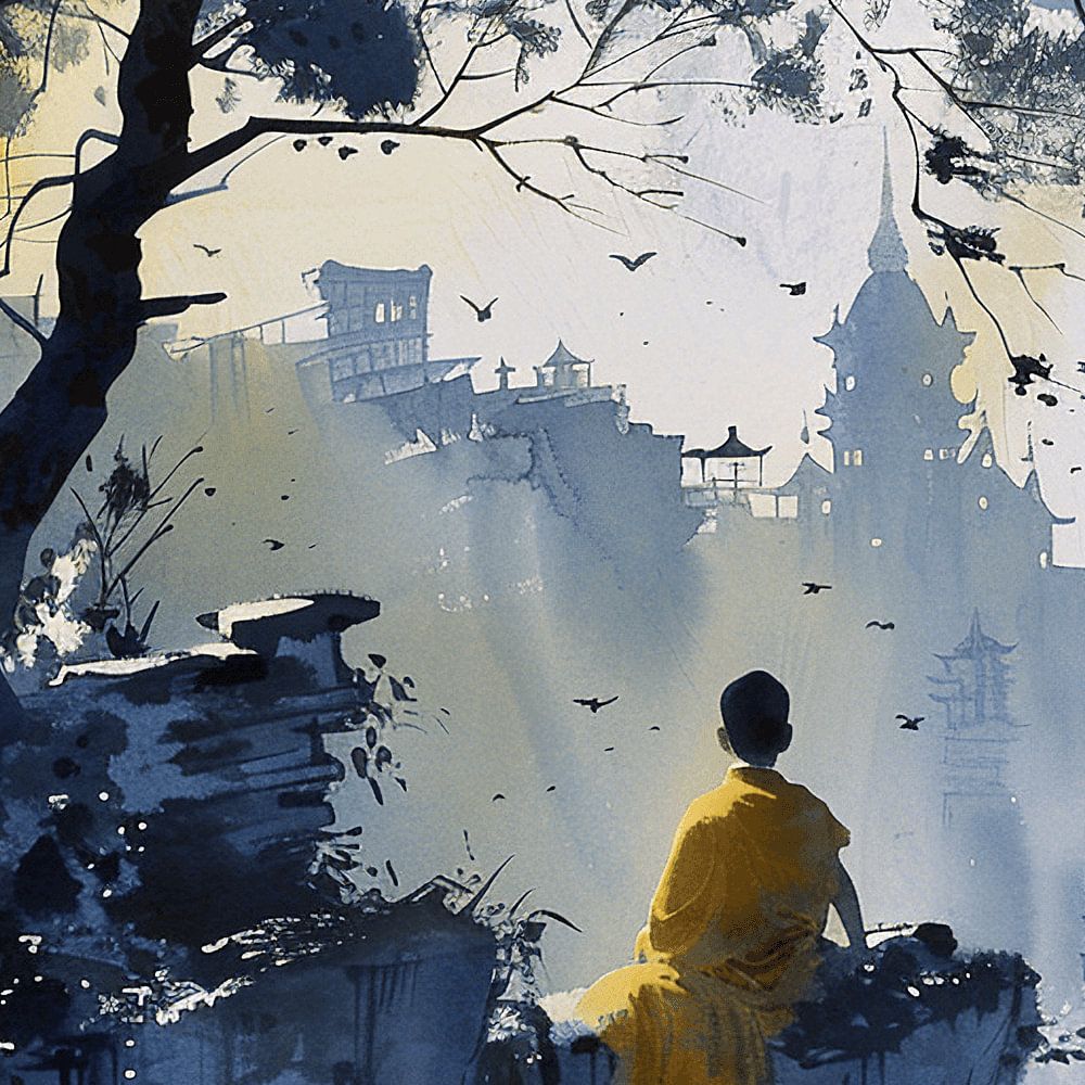 Cette œuvre d'art, parsemée de lavis de couleurs expressifs et de coups de pinceau sophistiqués, enveloppe le spectateur dans une aura d'immobilité et de contemplation profonde. L'harmonie de la palette de couleurs transmet un sentiment de calme, tandis que le vide de la composition, inspirée de l'art indonésien, évoque un sentiment de solitude intérieure. Il semble que le monde qui nous entoure se soit arrêté brusquement, créant un sentiment d'isolement.