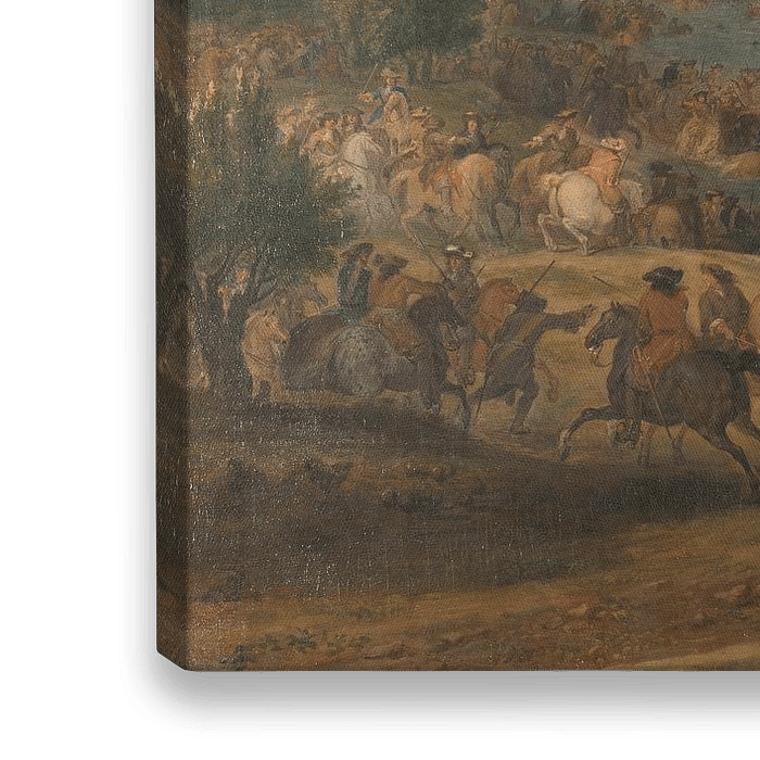À la tête d'une armée de 120 000 hommes, le roi français Louis XIV envahit les Pays-Bas le 12 juin 1672. Glorifiant Louis XIV, le peintre flamand Van der Meulen a enregistré la manœuvre militaire. Cependant, l'artiste a pris quelques libertés : à l'époque, le roi - représenté ici sur un cheval gris - logeait en fait dans un monastère voisin.
