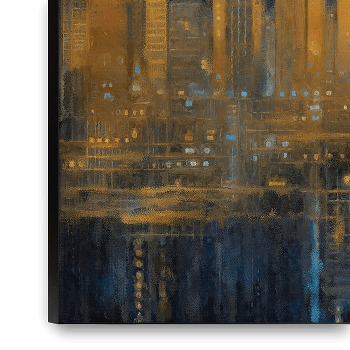 Cette œuvre représente la ligne d'horizon nocturne d'une ville baignée par la lumière dorée des étoiles et des lunes dans le ciel. Les gratte-ciel de la ville se dressent sur un fond bleu profond, où des cercles dorés forment le ciel étoilé. Les reflets des bâtiments et des étoiles dans l'eau en contrebas renforcent l'atmosphère sereine…