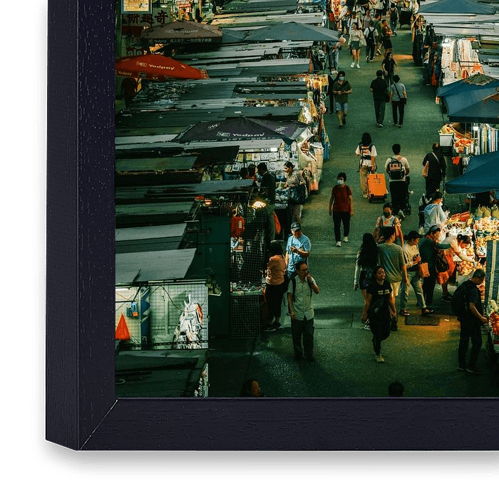 Cette photo captivante montre l'une des célèbres rues en escalier de Hong Kong, sur laquelle s'est étendu un marché humide très animé. La photo capture la vie authentique de la rue, les gens naviguant entre les étals colorés du marché, les aliments frais et les produits de tous les jours. Les gratte-ciel caractéristiques encadrent la scène et illustrent la densité urbaine unique de la métropole asiatique. Les wet markets sont le cœur palpitant de la culture alimentaire et de la vie sociale de Hong Kong, où les locaux viennent chaque jour acheter leurs ingrédients frais. La composition de marches abruptes, de personnes affairées et de l'architecture verticale de la ville met en évidence la créativité avec laquelle les habitants utilisent l'espace limité. Ce motif convient parfaitement aux amateurs de street photography, d'urbanité asiatique et de scènes urbaines authentiques. En tant qu'art mural, il apporte l'énergie, la diversité et le caractère unique de Hong Kong directement chez soi ou au bureau et rappelle le lien fascinant entre tradition et modernité dans l'une des villes les plus dynamiques d'Asie.