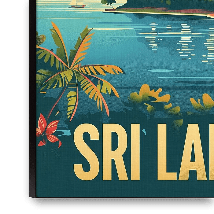 Invitez les merveilles du Sri Lanka tropical dans votre espace avec ce poster vibrant d'inspiration vintage. L'œuvre d'art présente une scène côtière sereine où un palais majestueux s'élève au-dessus de collines verdoyantes, encadré par des palmiers qui se balancent et des fleurs vives. Les eaux turquoise s'étendent à l'horizon, avec…