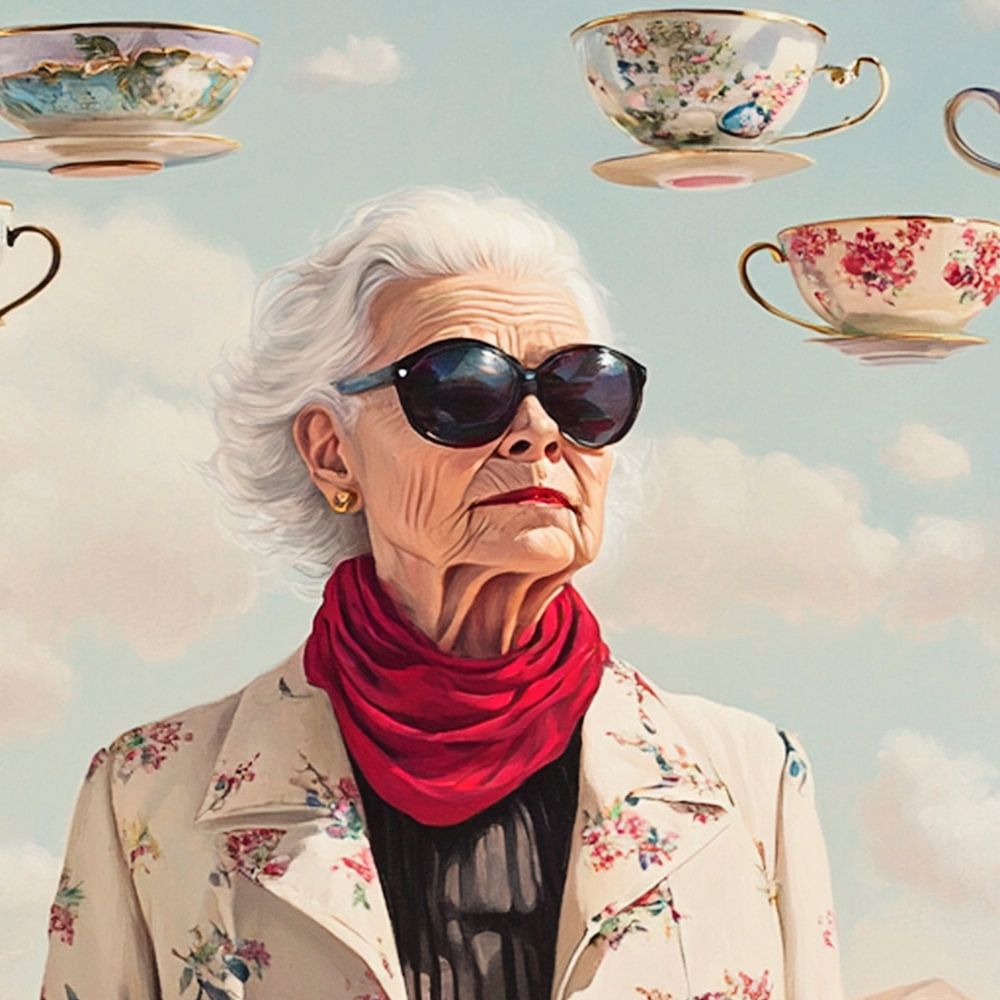 Une œuvre d'art qui allie charme, absurdité et puissance. Tea with Gravity montre une femme âgée élégante - lunettes de soleil, foulard rouge, manteau fleuri - se tenant imperturbablement sous un service à thé flottant. Les tasses en porcelaine et la théière flottent au niveau des nuages, comme une ode à la convivialité d'antan avec une touche de magie.