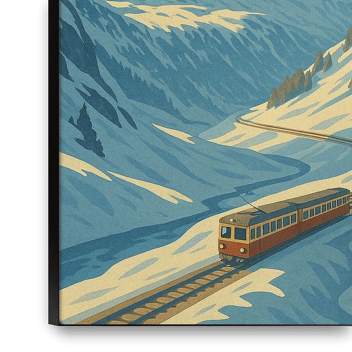 Cette œuvre d'art illustre la majesté époustouflante des Alpes, en Suisse, avec d'imposants sommets enneigés et un train sinueux qui traverse les montagnes. Reprenant le style classique des affiches de voyage Art déco, la composition mélange des bleus froids et des lumières chaudes et dorées, créant une scène à la fois puissante et paisible. Le Cervin et les sommets environnants dominent la vue, tandis que le train d'époque ajoute une touche nostalgique d'aventure.