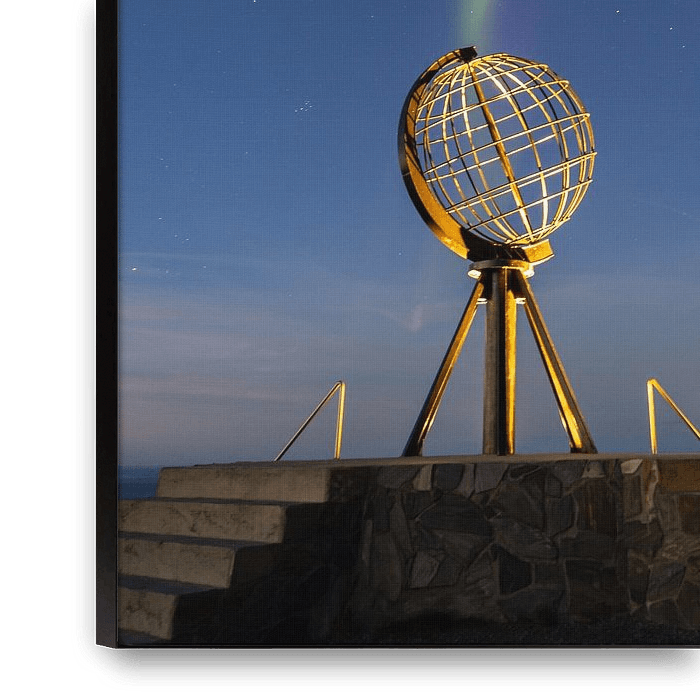 Quelle particularité de voir des aurores boréales à l'extrémité de l'Europe. L'aurore dansante au-dessus du monument du Cap Nord en Norvège.
