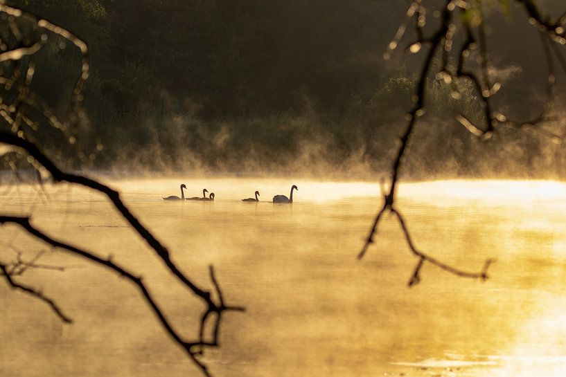 Achetez cette photo Lever de soleil avec une lueur dorée avec des cygnes par Jack Van de Vin sur toile, aluminium, ArtFrame ou photographie (encadrée), impression d'art en haute qualité et tout format.