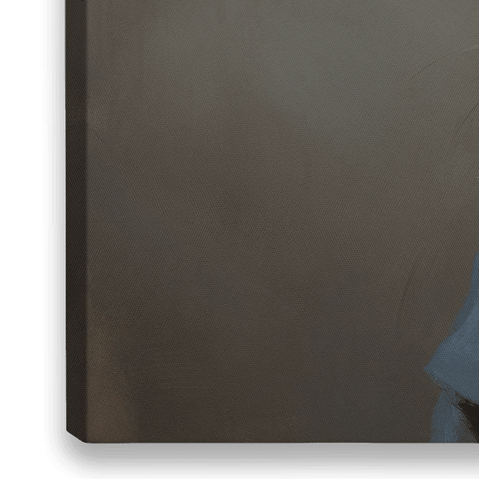 Lièvre habillé - Ce charmant tableau représente un lièvre aux traits humains, vêtu d'un manteau bleu à col blanc et d'un nœud papillon marron. Le style est réaliste avec une touche d'anthropomorphisme. Les couleurs sont principalement douces, avec des tons de terre contrastant avec le bleu froid du manteau, ce qui lui donne un aspect…