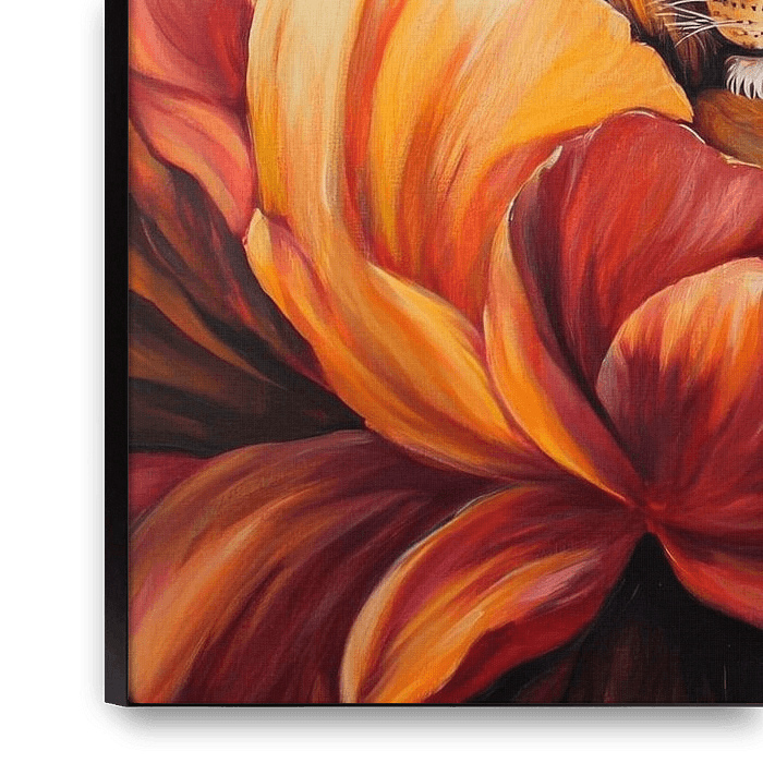 Au milieu d'une profusion de couleurs florales se repose un fier lion dont la crinière majestueuse rayonne de chaudes nuances de rouge. Les doux pétales l'enlacent comme un nid douillet, tandis que son regard pénétrant dégage à la fois calme et force. L'association harmonieuse de l'animal et de la nature allume une atmosphère magique…