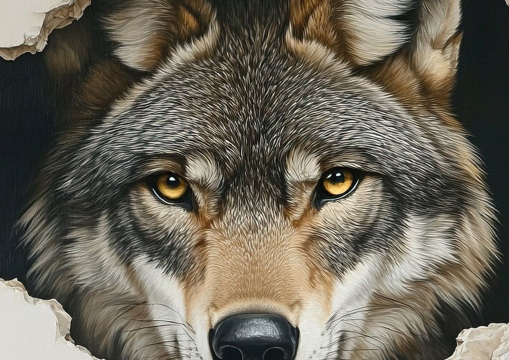 Loup perçant la surface - Cette peinture de loup montre une image réaliste et pénétrante d'un loup, dont la tête perce à travers un mur fissuré avec un regard vif et perçant.