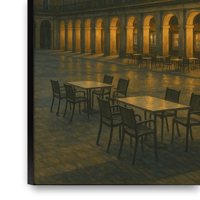 Chaque coup de pinceau ressemble à un murmure de l'histoire - des siècles de rassemblements, de musique et d'histoires absorbés par les murs de pierre de la place. L'ambiance est à la fois tranquille et cinématographique, une méditation sur la beauté du vide.
