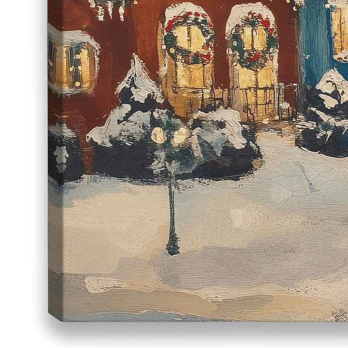Maisons de Noël | Maisons de Noël festives - Cette peinture de maison de Noël montre une rue pittoresque, couverte de neige, avec des maisons colorées et illuminées de façon festive, décorées de couronnes et de guirlandes de Noël, sous un ciel d'hiver peu lumineux.
