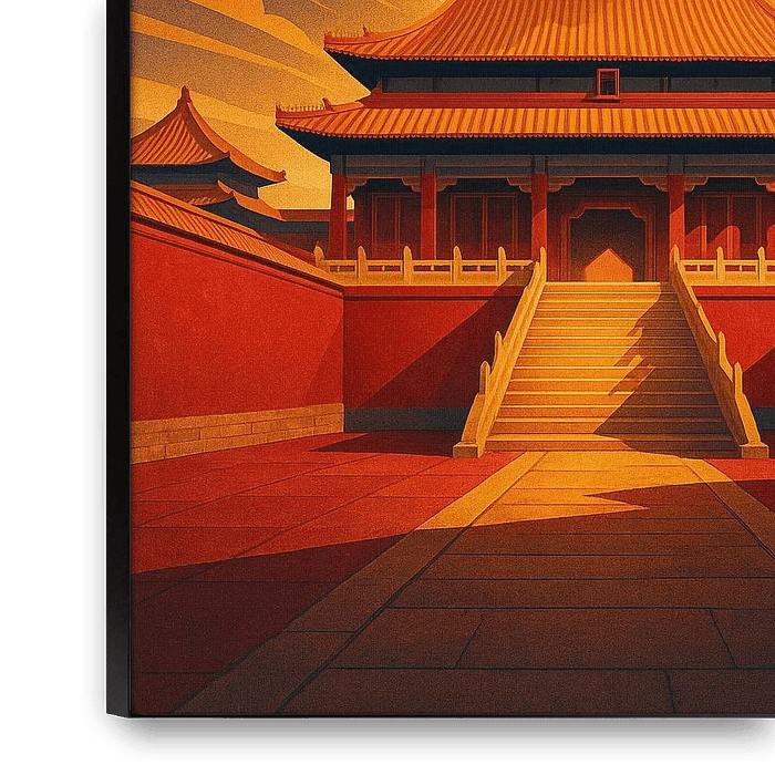 Entrez dans la grandeur de la Chine ancienne avec cette élégante affiche Art déco de Pékin. La scène capture la Cité interdite baignée dans la lumière dorée de l'aube, sa symétrie intemporelle et ses toits superposés s'illuminant sous les rayons du soleil. Rendu dans des rouges profonds et des ambres chauds, l'œuvre d'art évoque…