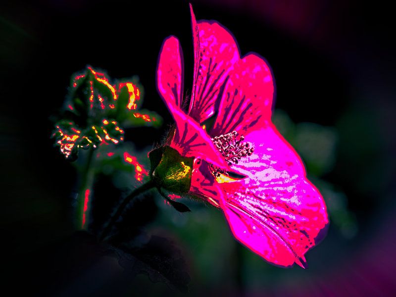 Une fleur de Malva "numérique" aux couleurs saturées sur un fond vert-bleu mystérieux.