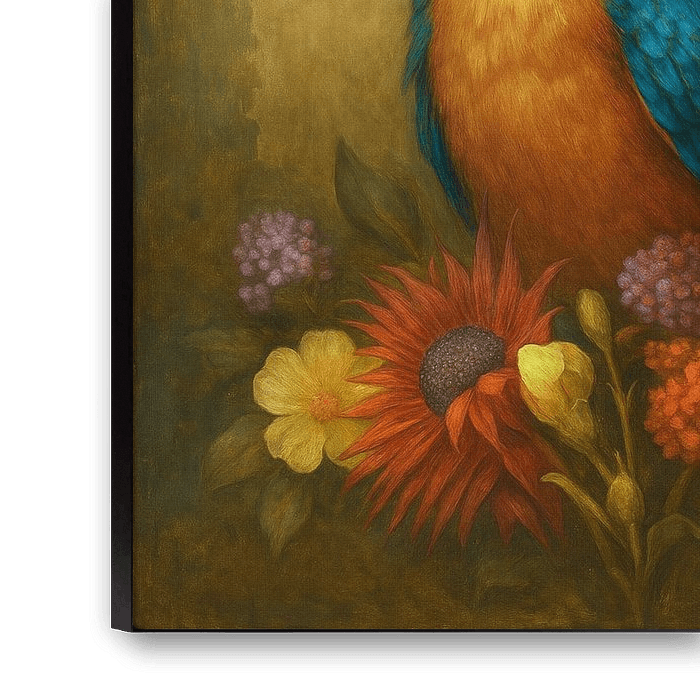 Ce martin-pêcheur est caché parmi les fleurs des champs en pleine floraison. Son plumage bleu vif contraste magnifiquement avec l'arrière-plan chaud et doux. Cette œuvre allie le réalisme à une atmosphère rêveuse, presque pittoresque. Parfait pour les amateurs d'oiseaux, de botanique et d'art vintage avec une touche de magie.