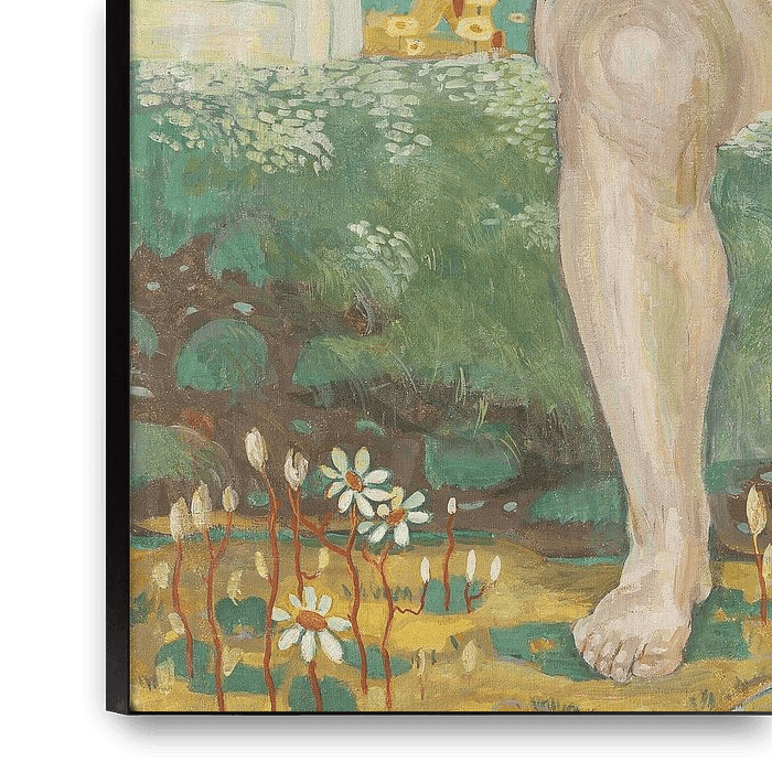 Grand portrait expressionniste précoce d'une femme nue assise, aux longs cheveux orange ondulés ornés d'une guirlande de fleurs (fleurs et feuilles). Elle a un corps pâle aux formes pleines, des yeux bleus et une expression sérieuse, les bras étendus dans une pose ouverte, presque embrassante. Elle est assise sur une colline ou une rive verte, près d'une source ou d'un ruisseau bleu qui serpente, entourée de marguerites blanches, de buissons verts et d'un paysage idyllique avec des collines ondulantes, des champs remplis de points (fleurs ?), des arbres et un ciel clair. La composition est encadrée par des murs légers ou des rochers ; signé "M. Pechstein" ; (ou variante). Sens Cette œuvre de jeunesse datant de 1906, année où Pechstein a rejoint Die Brücke, symbolise la vitalité, la fertilité et un lien harmonieux avec la nature. La femme en tant que "source" (quelle) représente la force vitale, la pureté et la liberté sensuelle - une image romantique, presque mythique, de l'homme "naturel". L'œuvre montre des influences du symbolisme et du premier expressionnisme, avec une célébration du corps dans un paysage arcadien, comme une échappatoire à la modernité industrielle. Technique Huile sur toile : couleurs vives et non naturalistes (cheveux orange, paysage vert, eau bleue) avec des coups de pinceau épais et expressifs et des motifs décoratifs (champs de fleurs sous forme de points). Les surfaces planes et les contours donnent un effet naïf et folklorique, inspiré par le post-impressionnisme et l'art primitif - une transition vers le style plus brut de Brücke.