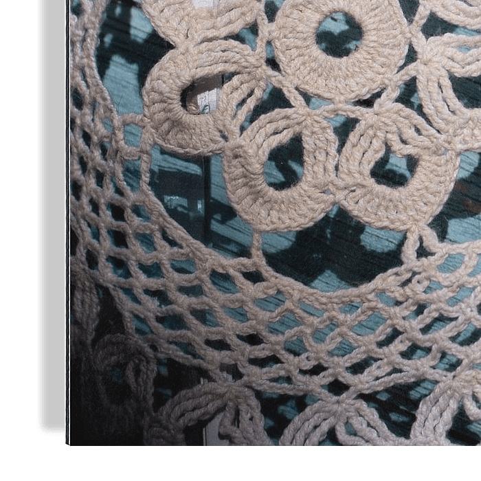 Une petite broderie vintage repose sur du bois bleu usé par les intempéries. Cette nature morte tranquille réunit l'art textile, la nostalgie et l'éphémère. Une ode au travail fait à la main, au temps et à la tendresse, parfaite pour ceux qui aiment les détails et les couleurs douces dans la maison.