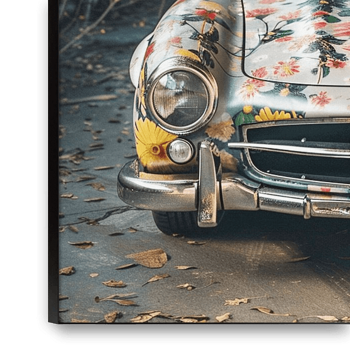 Cette image montre une vieille Mercedes-Benz décorée de motifs floraux colorés et psychédéliques peints à la main. Les couleurs brillent dans différentes nuances de bleu, de jaune, de rouge et de vert, tandis que l'état d'origine, usé et rouillé, de la voiture reste reconnaissable. L'avant du véhicule, avec son phare rond et sa calandre distinctive, lui confère un look nostalgique. Sur le pare-brise, on peut voir une inscription, ce qui donne à l'image une touche rebelle et artistique. La voiture se trouve dans un environnement naturel, légèrement en friche, ce qui souligne son aspect alternatif et libre.