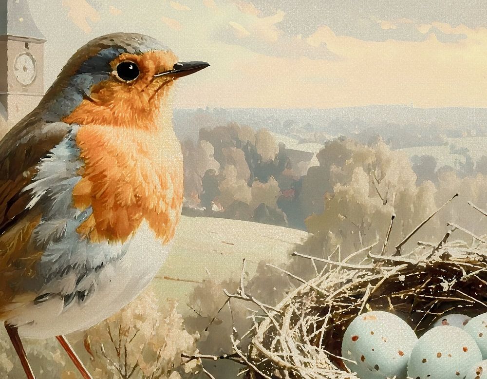 Un rouge-gorge a fait son nid dans une tour, surplombant un beau paysage avec un clocher d'église, des arbres et des prairies.