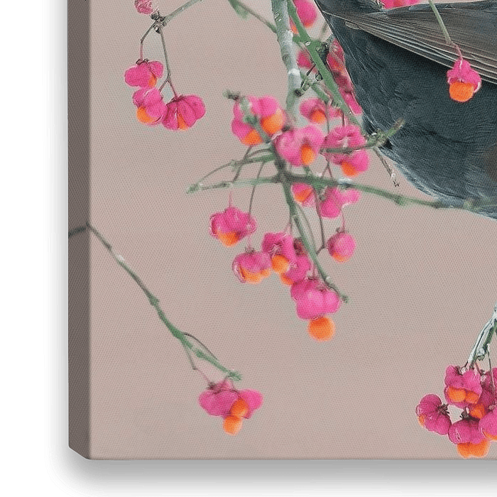 Femelle de Merle noir assise dans un chapeau de cardinal (Euonymus europaeus).