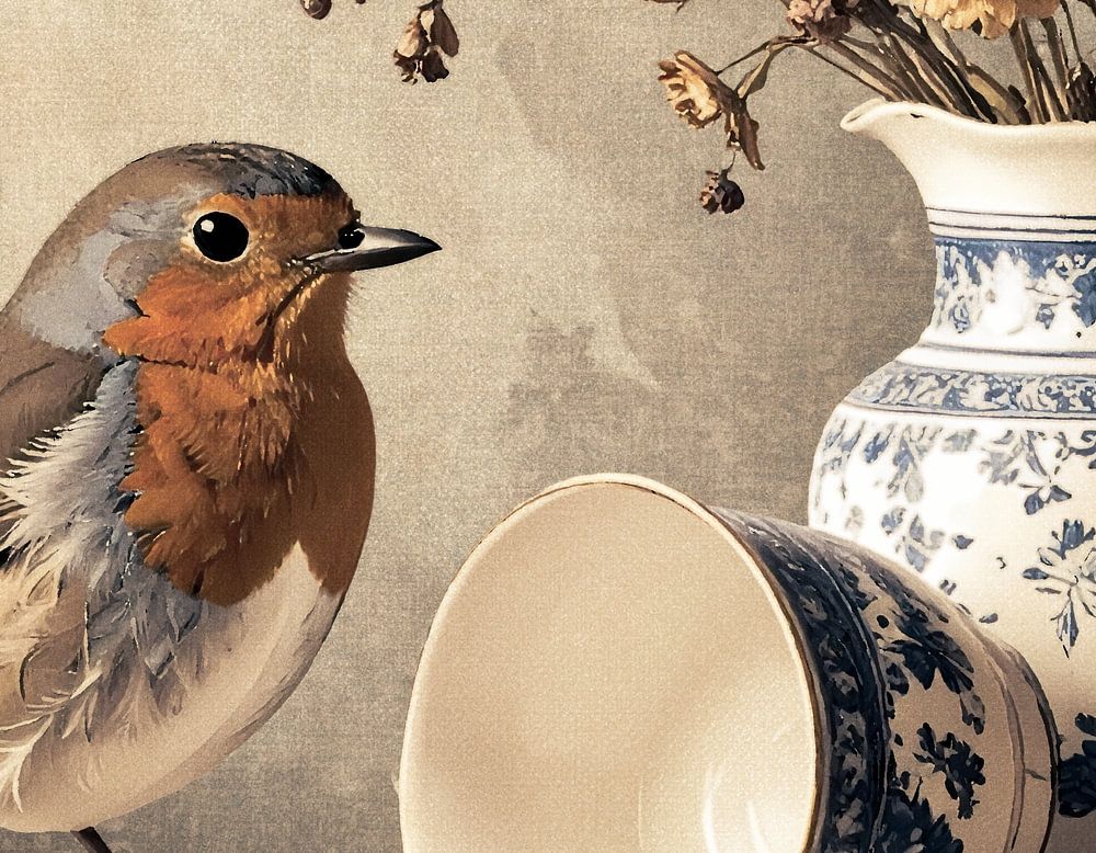Un rouge-gorge se tient joyeusement à côté d'une tasse bleu delft et d'un vase de fleurs séchées. Aspect vintage avec une couche diffuse de couleur crème. Œuvre d'art élégante et chaleureuse avec une touche de confort d'antan.
