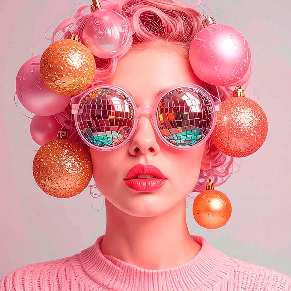 Une belle femme, portant de grosses lunettes avec des boules disco, a des boules roses et orange dans les cheveux et les oreilles. Ses cheveux, son pull et ses lunettes sont également roses, des couleurs claires qui éclairent les jours sombres de la période de Noël. L'image a été générée à l'aide de ai.