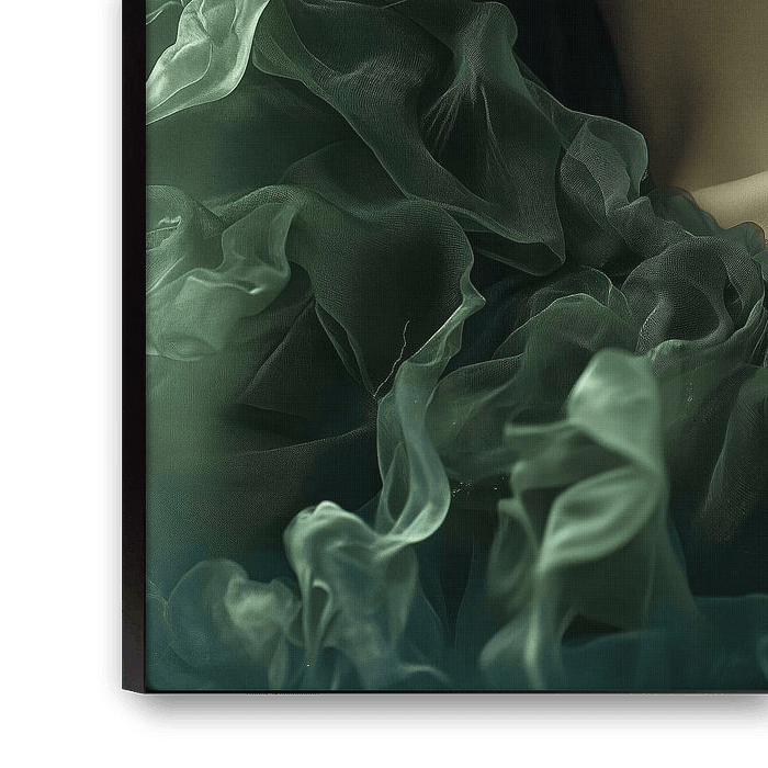 Un portrait éthéré baigné de tons verts mystérieux, où les contours doux se fondent dans une composition flottante de tissus soyeux. L’image dégage une profonde sérénité, renforcée par les yeux fermés et les cheveux flottants qui créent une sensation d’apesanteur. L'éclairage raffiné et les draperies vertes fluides se fondent dans une atmosphère de rêve qui oscille entre réalité et fantaisie.