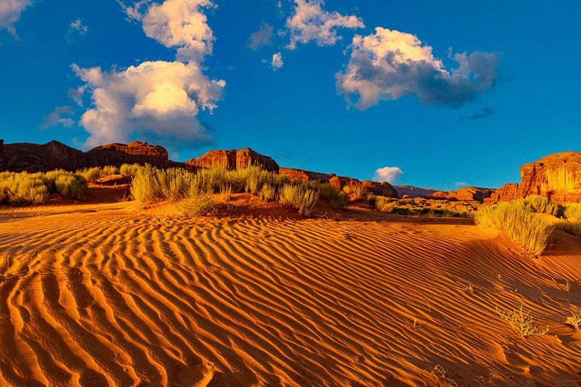 Imaginez un coucher de soleil enveloppant les buttes emblématiques de Monument Valley d'une lumière chaude et dorée. Le ciel passe du bleu vif à l'orange profond tandis que les silhouettes des majestueuses formations rocheuses se détachent du paysage. Il ne s'agit…