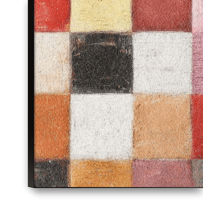 Cette œuvre se compose d'un rythme de petites surfaces colorées qui forment ensemble un motif calme mais vivant. Les tons chauds de rouge et d'orange sont entrecoupés de couleurs plus douces telles que l'ocre, le gris et le blanc, créant ainsi un équilibre entre jeu et harmonie. L'alternance des couleurs permet à l'œil de découvrir à…