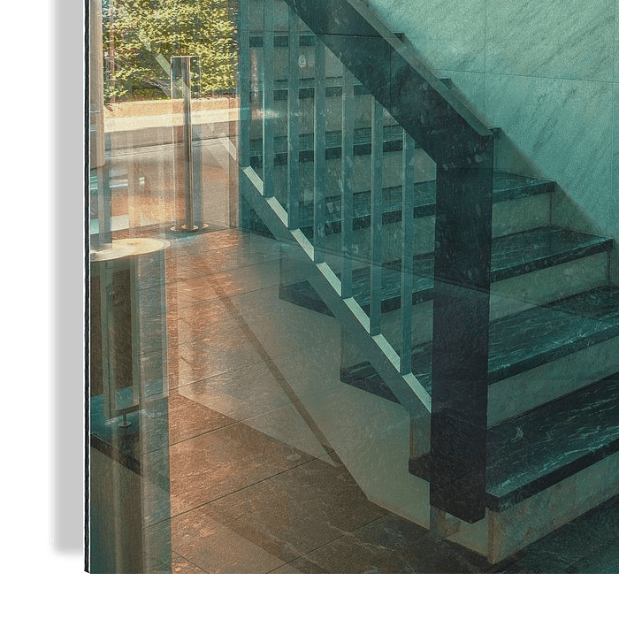Cette photographie impressionnante montre la vitalité de Zurich. Grâce au reflet de l'environnement dans la vitre de l'entrée, une cage d'escalier avec son escalier est mise en perspective. La composition donne un sentiment de sérénité urbaine et est parfaitement adaptée à la détente dans un espace de vie ou de travail moderne. Cette…
