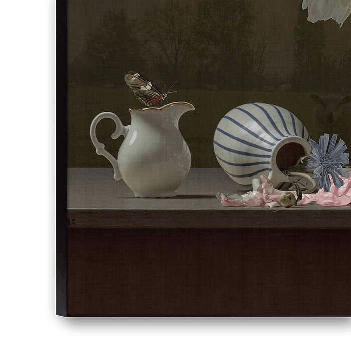Collage photographique horizontal de nature morte d'un grand pot blanc avec une toile de jute autour de la moitié inférieure avec des renoncules roses et des tulipes orange dans le pot. Le tout sur une table simple gris chaud avec deux cruches et des feuilles de renoncules et des renoncules sur une scène rurale sombre et légère en arrière-plan avec des moutons et un soleil levant. Papillons et insectes pour l'observateur attentif.