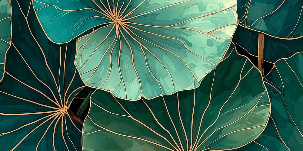 Une composition de feuilles de lotus superposées aux nuances de turquoise et de vert jade, entrelacées d'élégantes lignes dorées qui les mettent en valeur tel un délicat réseau. L'œuvre dégage un luxe serein, avec ses formes organiques et ses détails métalliques créant un équilibre parfait entre douceur naturelle et sophistication moderne.