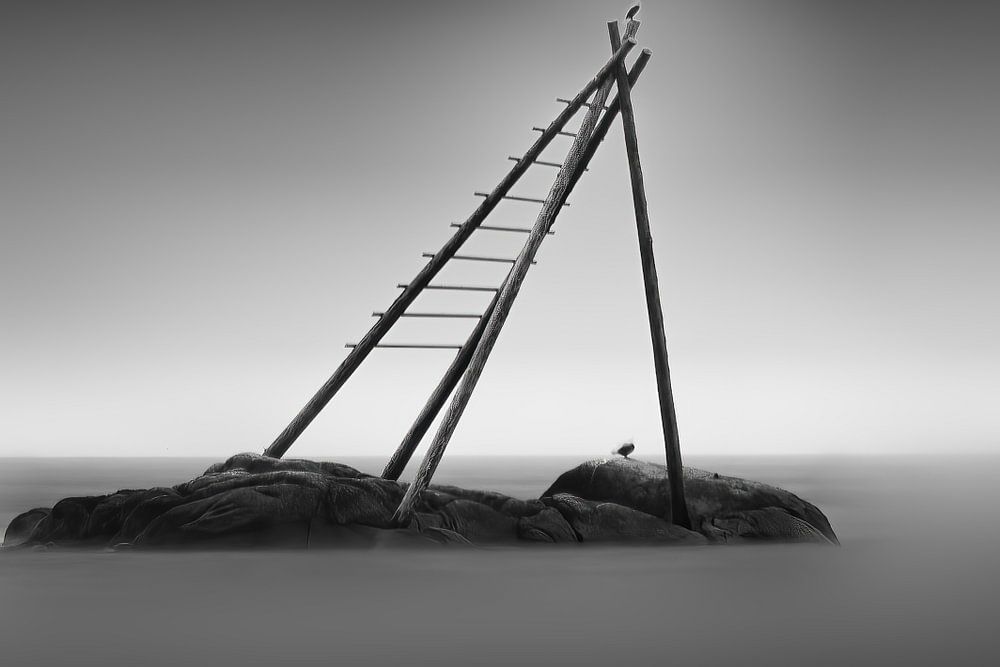 Cette photo minimaliste en noir et blanc montre une échelle en bois s'étirant dans l'eau calme, entourée d'une côte rugueuse et accidentée. La composition simple souligne la beauté naturelle du paysage, tandis que le noir et blanc confère à l'image un aspect intemporel et classique.