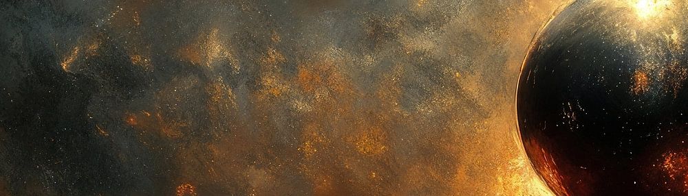 Objet lumineux mystique - Cette peinture abstraite montre au centre un grand objet sombre et brillant ressemblant à un œuf, entouré d'une lueur vibrante de rayons lumineux orange et dorés, contrastant avec un arrière-plan aux tons bleus et gris profonds et froids suggérant la texture et la profondeur.