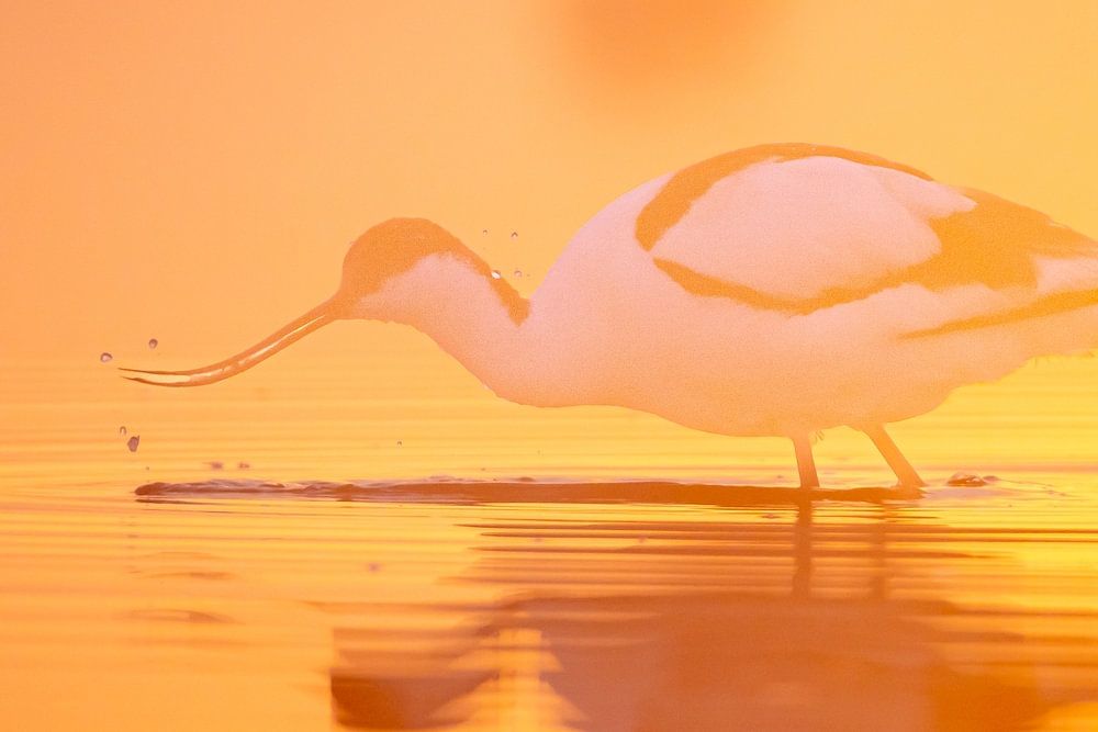 Oiseaux | Avocet au lever du soleil avec contre-jour doré, orange et jaune 1