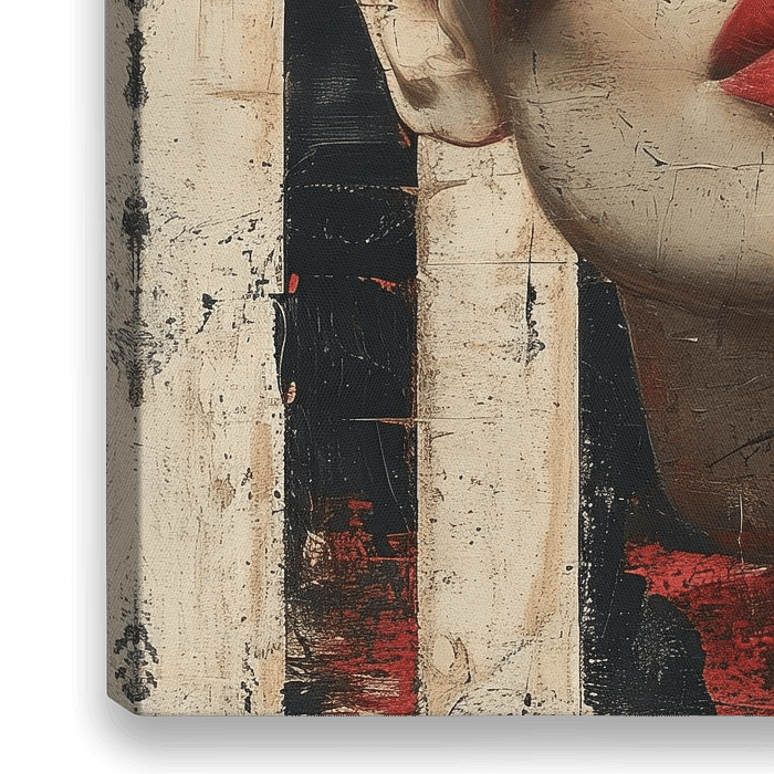 Achtergrond en materiaalgebruik ondersteunen die twee hoofdelementen zonder te storen. Verticale, afgewisselde banen van zwart en crème vormen een gestileerde achtergrond, licht verweerd en met zichtbare penseel- en paletmesstructuren. De artiest werkt met meerdere verflagen: transparante glacis naast dekkende pigmentvlakken, krassen en subtiele vegen. Daardoor voelt dit portret schilderij zowel hedendaags als archaïsch — een moderne glamour gevat in een ruwe, bijna oudere textuur. Alles wijst op een bewuste keuze voor contrast: rood tegen zwart, gladheid tegen ruwheid, anonimiteit tegen expressie.