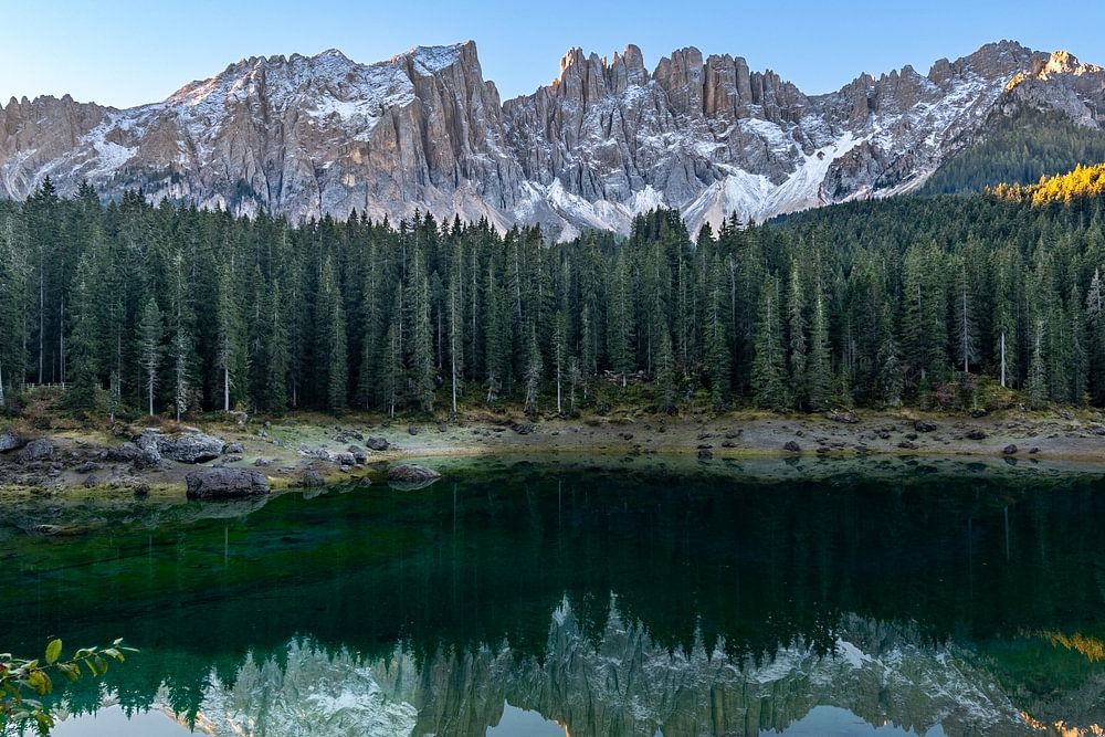 Panorama du lac Karersee dans les Dolomites dans la lumière du petit matin